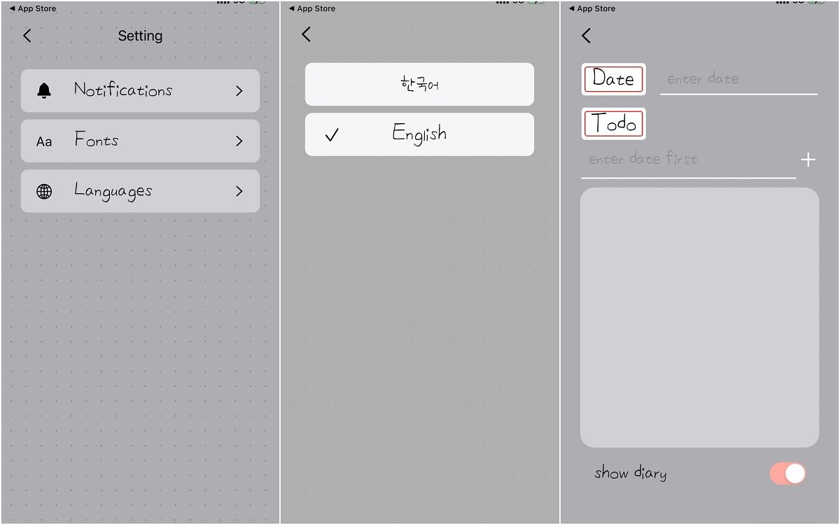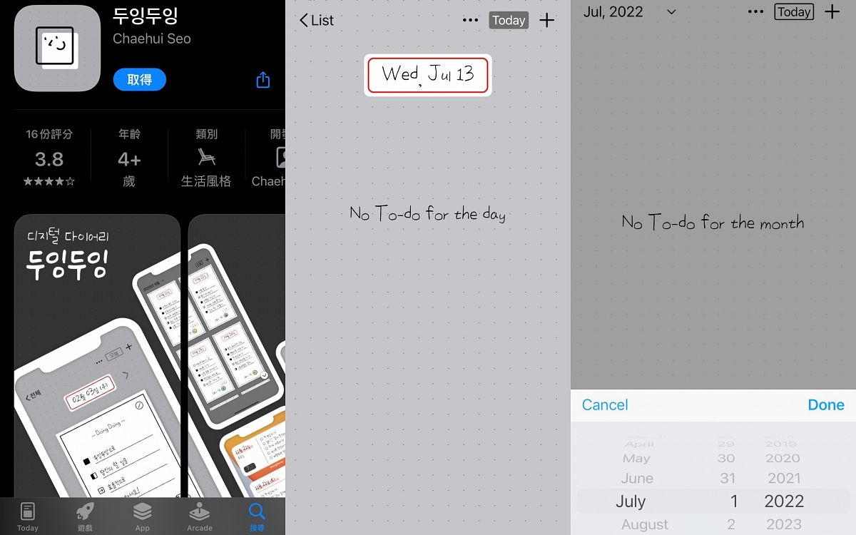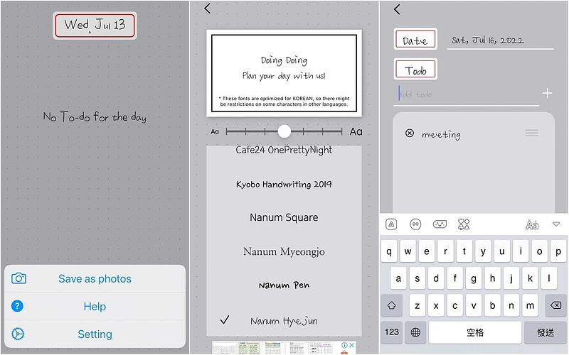 這款App雖然是韓文,但英文字搜尋doing doing就能找到,簡約的灰色頁面十分耐看、操作上面也很直覺,只要按加號就能開始新增備忘錄。