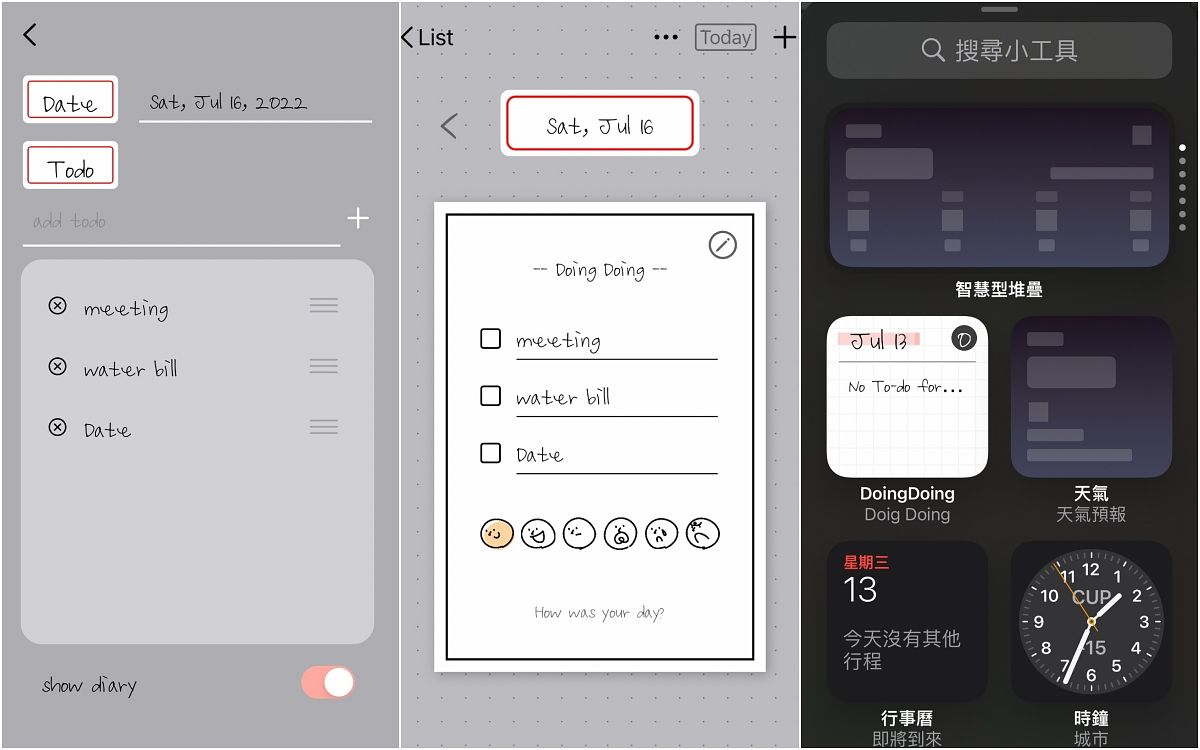 備忘錄條列式好之後,下方還有可愛小圖示可以挑選記錄當天的心情,設定好之後就能到手機桌面增加小工具,選擇Doing Doing的備忘錄、直接拉到桌面之中。