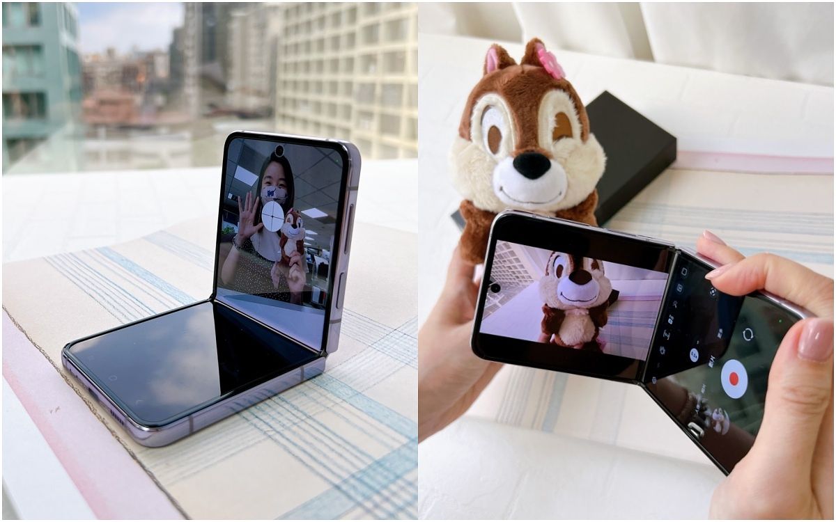 將Z Flip4稍微折起,便可啟動FlexCam(指Flex模式的相機體驗。轉軸介於75°至115°之間時,支援Flex模式),以免手持方式拍攝影片,或以各種角度進行自拍。三星更與Meta建立合作,FlexCam同能支援Instagram、WhatsApp和Facebook等社群平台。