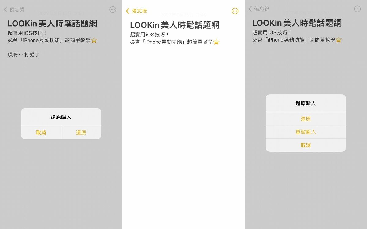 所以若想回上上一步,晃動一次手機並選擇還原後,可再直接晃動第二次手機,並再度選擇還原,就能回到前前一個狀態,而若當還原後,又想重新輸入一次相同內容(被還原刪除掉的內容),那可選擇重作輸入,就不用辛苦再打一次了~