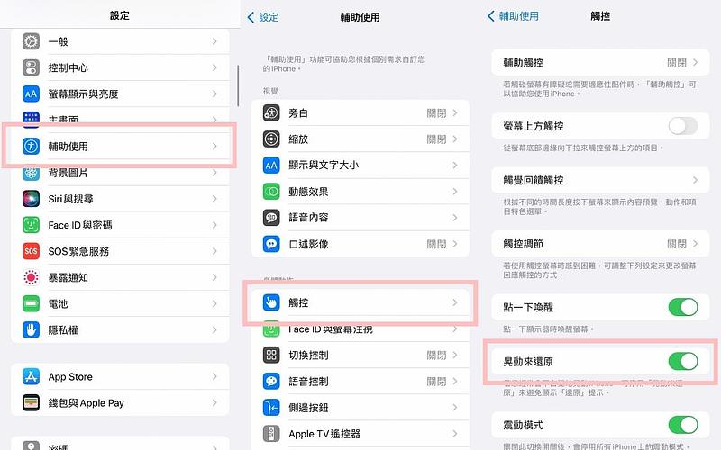 若iPhone曾經關閉了這個「晃動還原輸入」功能,可透過「設定」➜「輔助使用」➜「觸控」➜開啟「晃動來還原」功能,就能享受這個便利的小技巧囉!