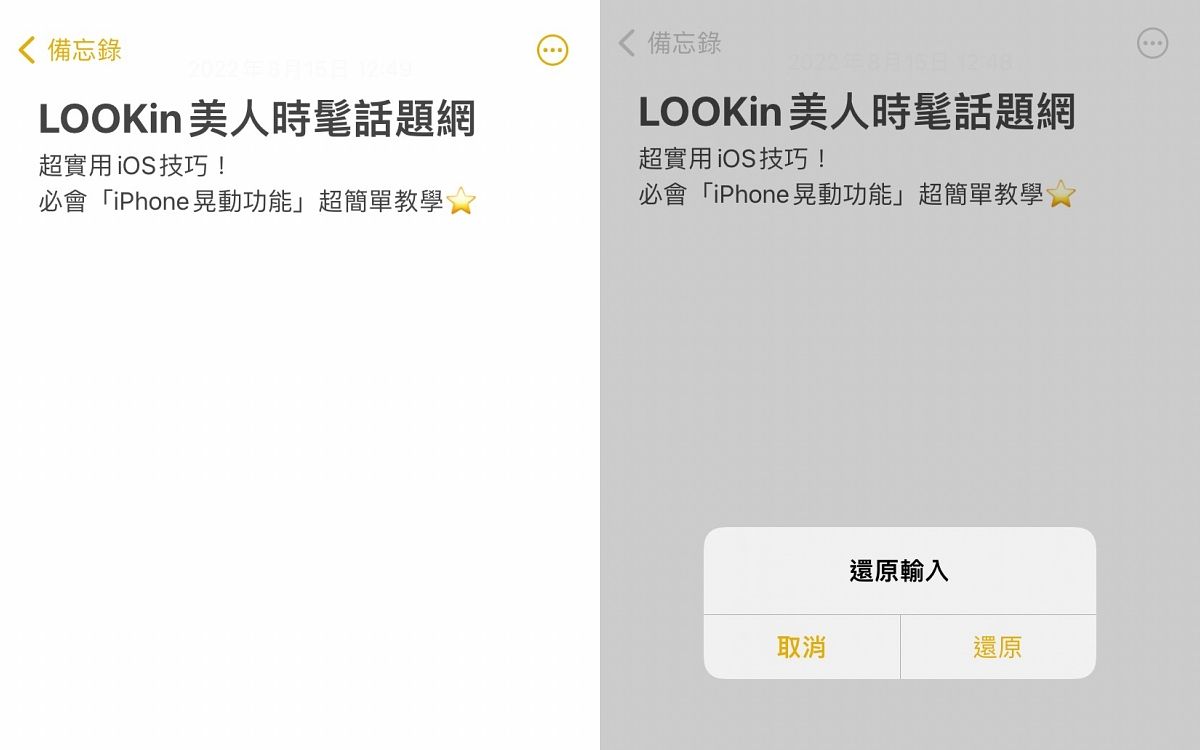 其實這個小技巧就等於「回到上一步」的功能,只是iOS將這個功能改以晃動的輔助使用方式呈現,而非於系統上設置一個按鈕,學起來之後操作反而更加簡單喔!而且還原的內容除了自行輸入的文字之外,複製貼上的字句、指繪都可以應用,超級方便又實用。