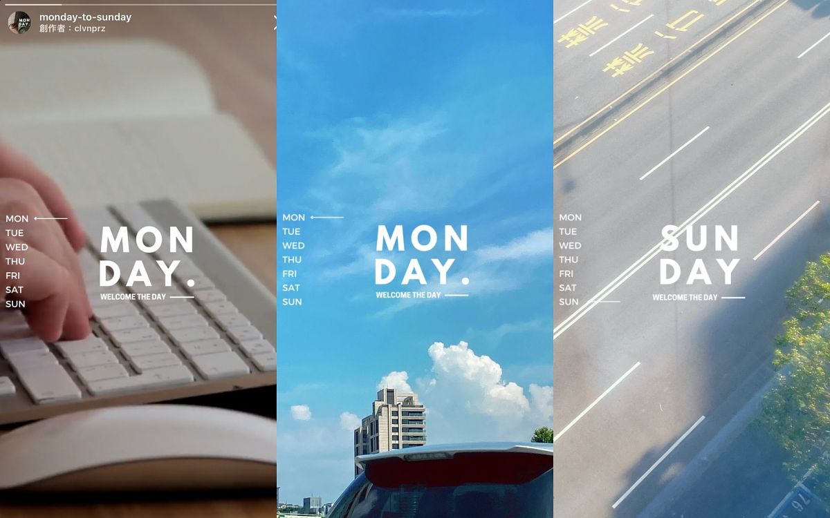 以百搭的白色與鮮亮的黃色,搭配各種不同字型的英文字詞,整體畫面的文字排列非常豐富,有週一到週日七種不同版本可切換,很值得載來日常拍攝使用!