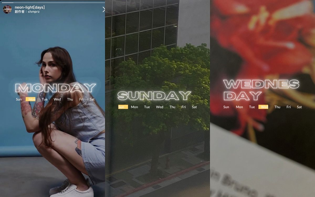 霓虹感的粗體英文字特別有現代潮流的氛圍,整體偏暗的濾鏡也提升畫面質感,下方週一到週日的標示也更添獨特辨識性,使用在顏色強烈的照片上超合適!