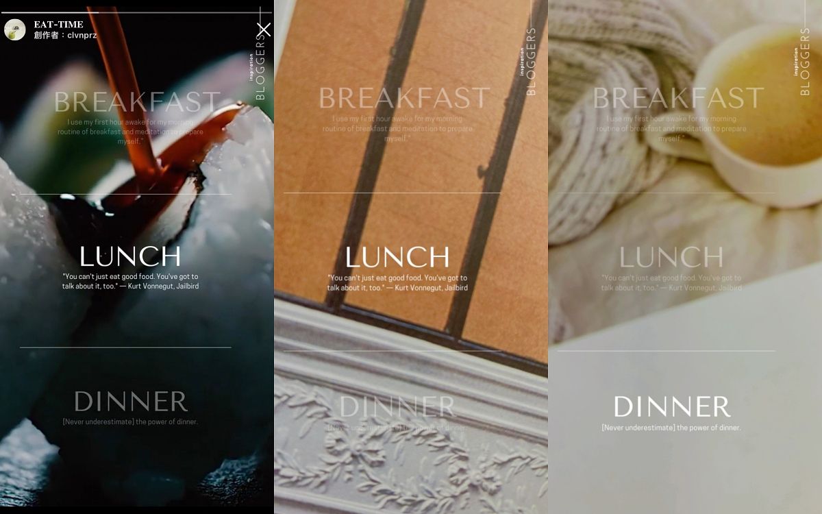 濾鏡以上中下三個等份區塊搭配早餐、中餐、晚餐的細體英文字與小字句,有種家居雜誌感的簡約質感,特別推薦給喜歡拍攝食物、餐點的人喔!