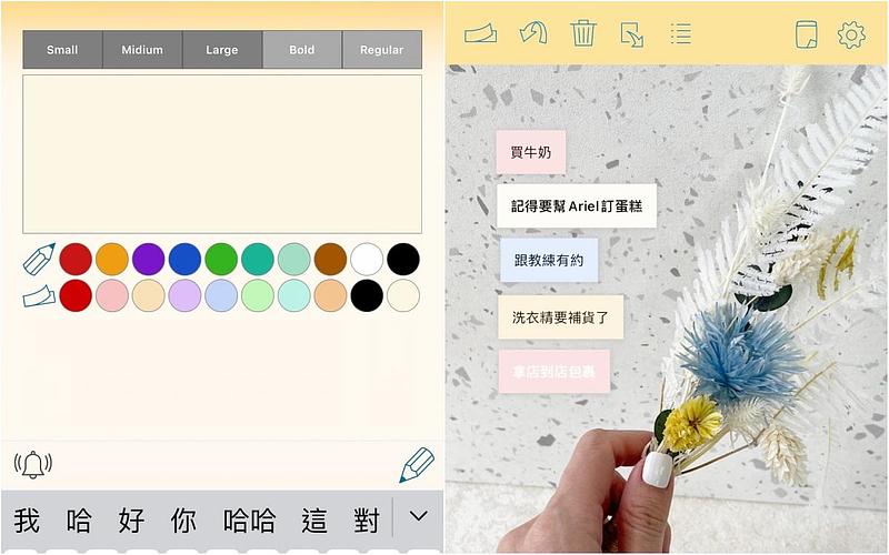 便條紙與文字共有20種顏色可以任意變換,字體則有大、中、小三種尺寸,也能選擇粗體樣式,而便利貼的位置也能任意放置,搭配內建的背景格式使用上十分方便。