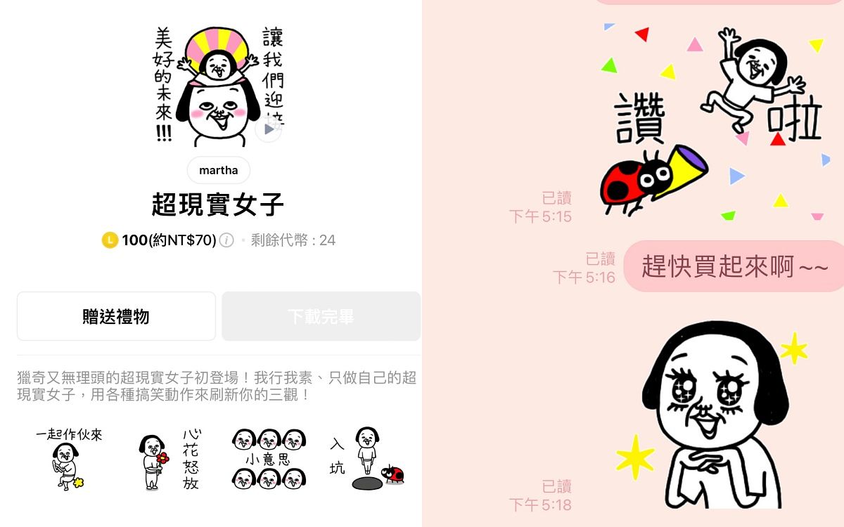 超現實女子是別人贈送給我的貼圖,這個女子的畫風超級好笑,再加上搭配的用語非常無理頭,常常丟給別人自己都會想笑,在工作苦悶時,不妨點開來看看心情會突然大好喔!(影音總編輯 Yulie)