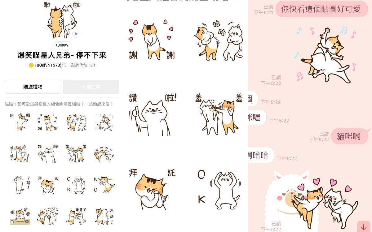 我最常使用的貼圖就是爆笑喵星人兄弟,因為本身喜歡貓咪,再加上貼圖裡有各種日常用語,像是謝謝、OK、辛苦了...等等!不管跟家人好友或客戶廠商等對象都能使用得到。(影音總編輯 Yulie)