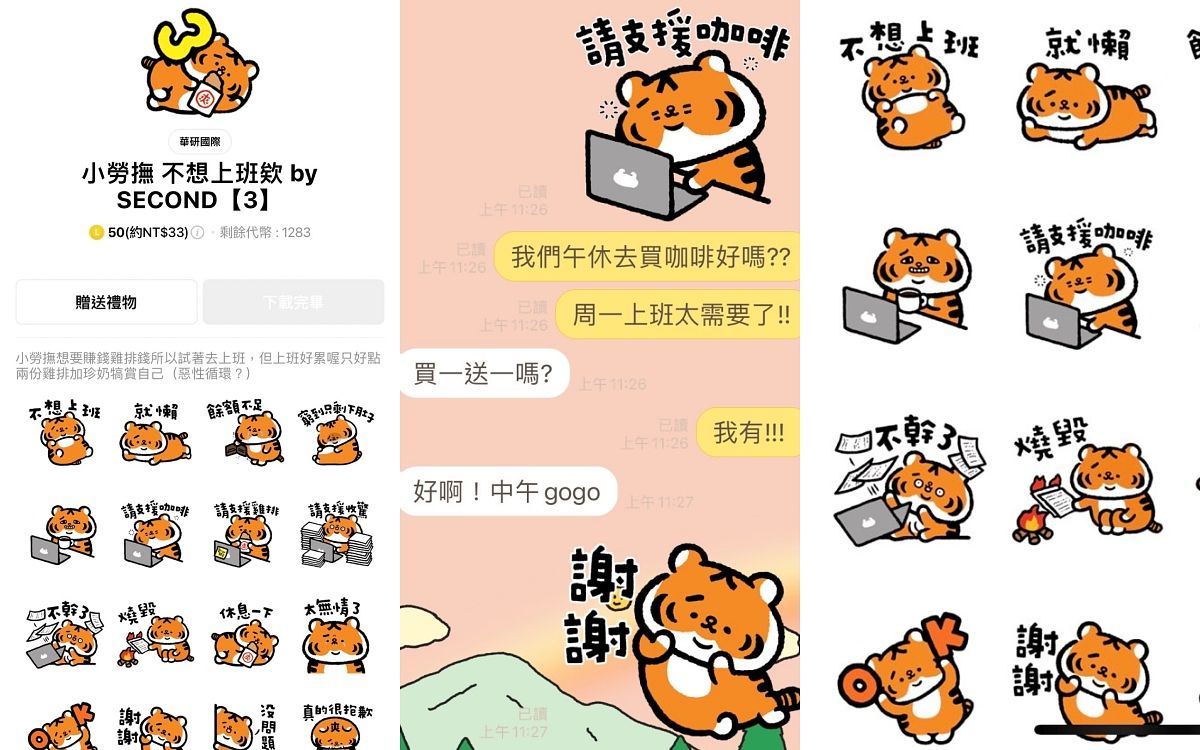 從去年出道的小勞撫從開始到現在都是我的愛,軟呼呼的老虎形象實在是太可愛,每個貼圖我都有買!這系列系列對於職場人真的非常好用,從群組最常會出現的謝謝、收到,或是要跟好姐妺偷偷發懶或小抱怨都超級好用,搭配可愛小勞撫無敵療癒!(行銷企劃副理Pobbi)