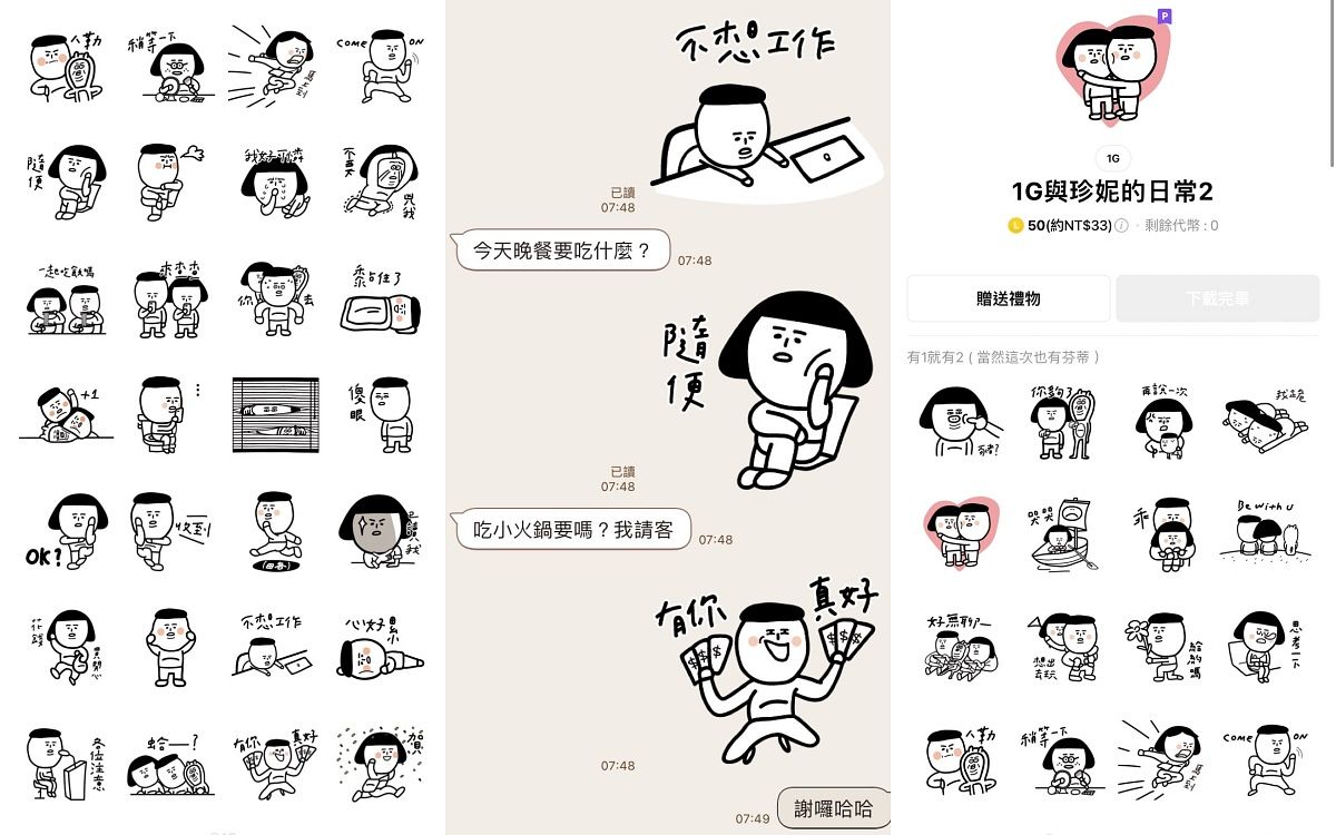 平常時就很喜歡看1G跟珍妮的IG貼文,總能畫出生活中、情侶間的各種真實日常點滴,讓人深有同感!而這款貼圖平常在與男友及好友對話時超時實用,有日常必備的、撒嬌溫馨的,也有厭世、懟人的貼圖,搭配1G和珍妮可愛、傳神的表情與肢體動作,真的是怎麼用也用不膩,還會讓人看到不禁會心一笑呢!(服裝企劃主編Ainsley)
