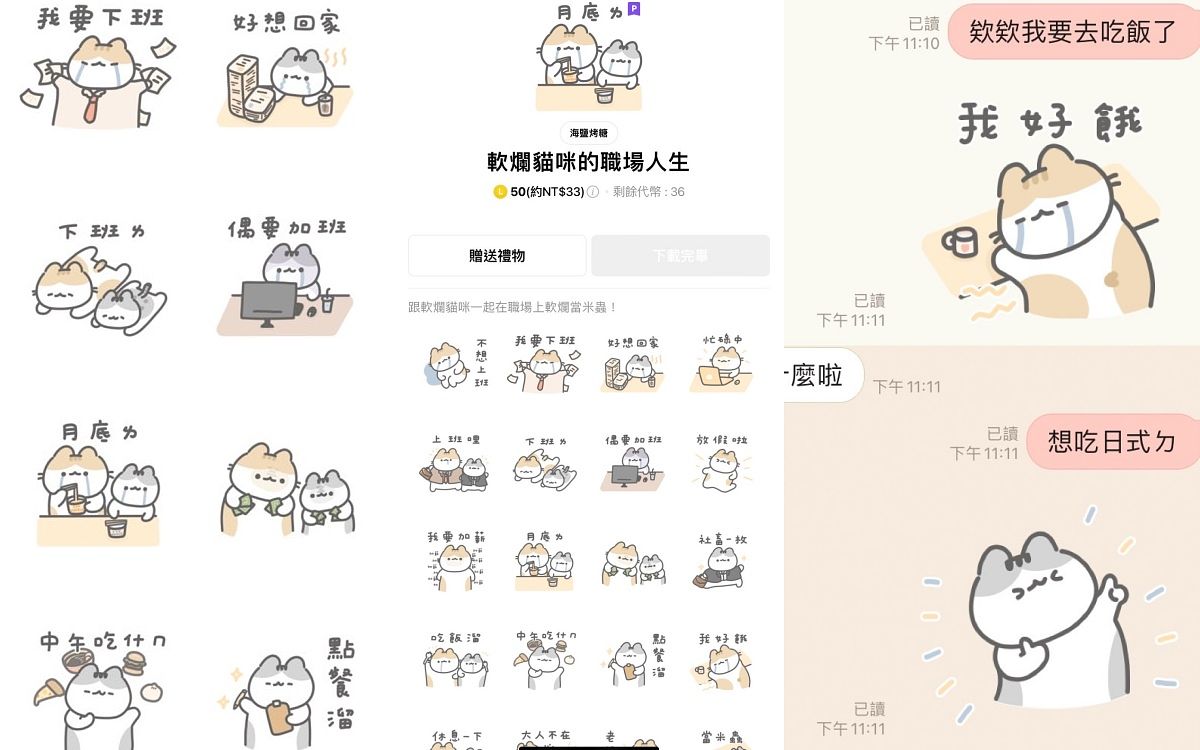 大家對這兩隻貓咪應該不陌生,他們很常出現在免費貼圖中,作者海鹽烤糖的貼圖都是以這兩隻貓咪為主,灰貓和橘貓都長得十分可愛,身邊的朋友們都被我推坑了,這組貼圖對於有在上班的人非常好用!基本上一整天的對話都能用貼圖解決,我最常用的是「我好餓」、「中午吃什麼」這兩款貼圖,搭配上貓貓們的可愛表情就會讓人心情很好~很推薦職場人入手唷!(數位專案企劃Sunny)