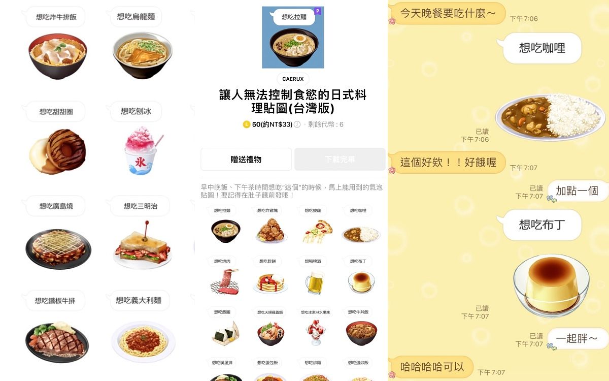 LINE對話裡最容易出現的「吃什麼?」話題,這組貼圖有一切解答!一共40款美食,從甜點到正餐應有盡有,要回話的時候就算沒有想法、不知道要吃什麼,還可以從找靈感,是不是超方便!甚至圖片上還有對話框,直接幫你回話連字都不用打!(生活企劃主編 Enid)