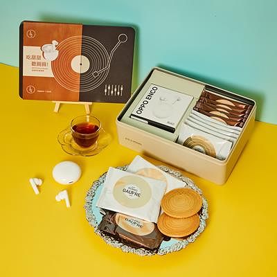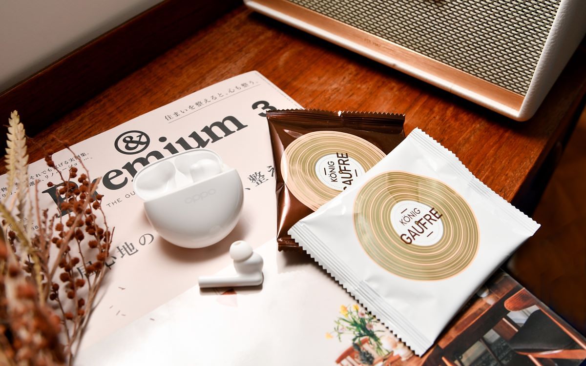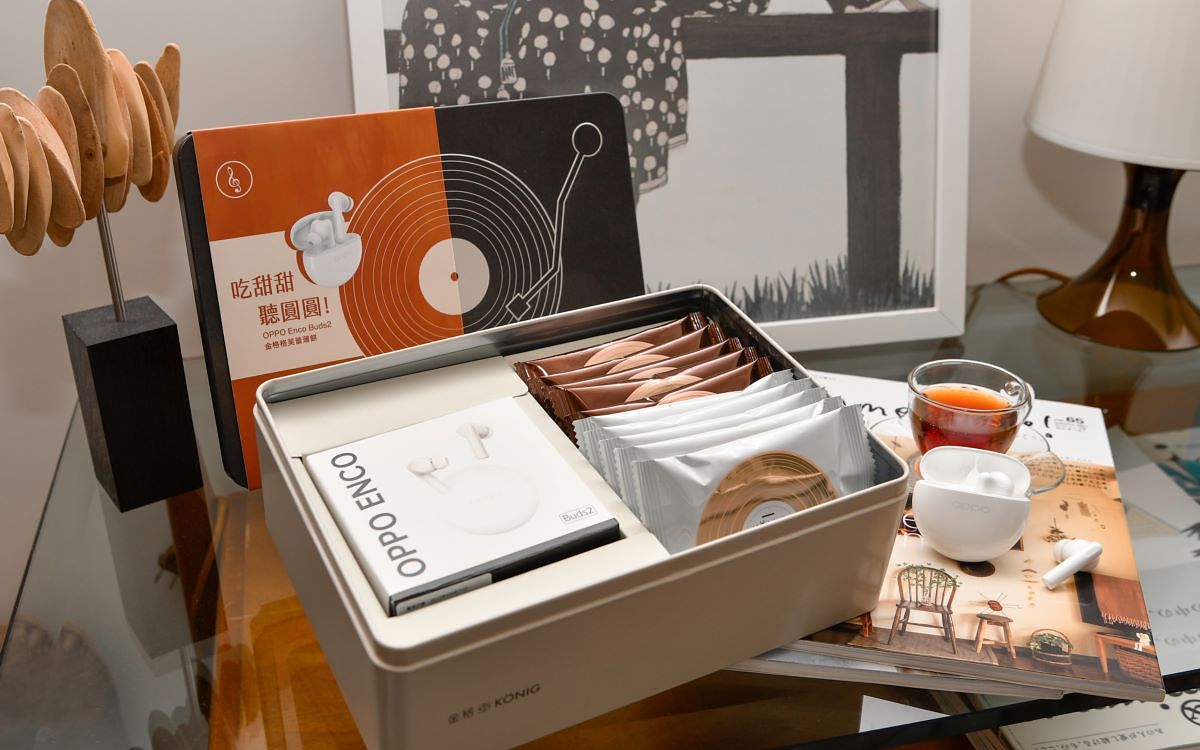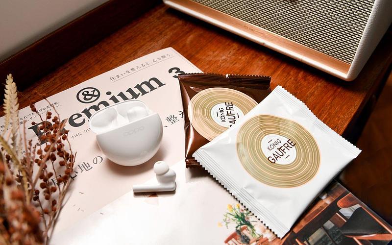 具懷舊風格的聯名禮盒,含有「吃甜甜.聽圓圓」的祝福寓意。OPPO Enco Buds2 和格芙蕾薄餅以同樣都是圓形的外表,傳達和諧、圓滿之意。戴上OPPO Enco Buds2 ,挑一片唱片造型的薄餅,即能體驗大動圈帶來的強勁重低音和Enco Live調音功能,更可提供長達28小時的聆聽,享受「音質」與「續航」兩大特色。聆聽時搭配苦甜巧克力及北海道牛奶的雙重風味,在耳邊、在嘴裡緩緩流瀉而出,感受外層香脆迷人,內餡柔滑順口的滋味。將音樂與經典甜點完美結合,體會科技潮流的真無線耳機,遇上職人經典工藝打造的格芙蕾薄餅,以視覺、聽覺、味覺交織出最動聽的午後食光圓舞曲,成就一場穿越時空的跨感官饗宴。