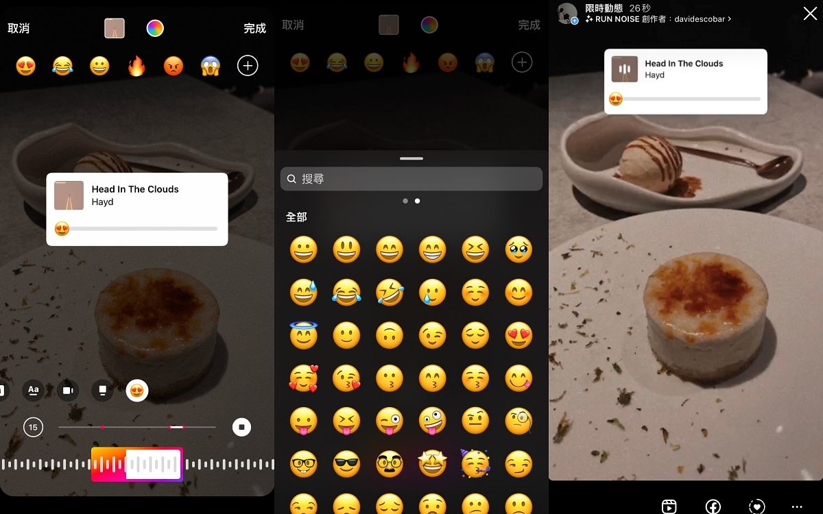 限時動態的音樂貼紙不只有歌詞功能,最新IG官方更彙整了互動性貼紙的功能,使表情滑桿的回饋互動貼紙和音樂貼紙結合,也能夠自行選擇emoji的表情或圖案符號,發限動時增加和觀看者的互動體驗,同時也讓音樂貼紙多了點趣味,日常和朋友一起玩超級促咪!