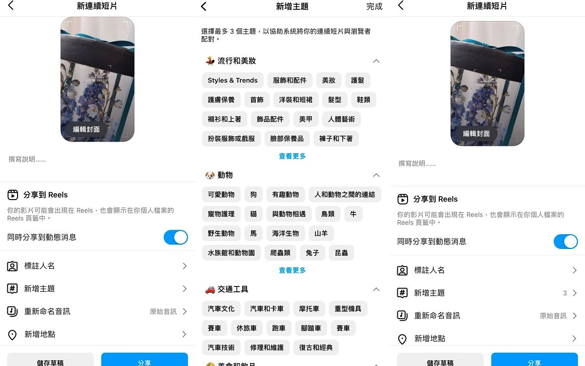 IG自從reels連續短影片功能推出之後,就大受潮流趨勢喜愛,這個reels主題功能在新增每個新連續短片時,可自由挑選三個相關主題搭配,能夠幫助短影片更好地被分類在所屬類別,並有效推廣到準確的觀看對象,進而提升觀看次數及觸及機率,非常適合經營專業帳號的人使用喔!