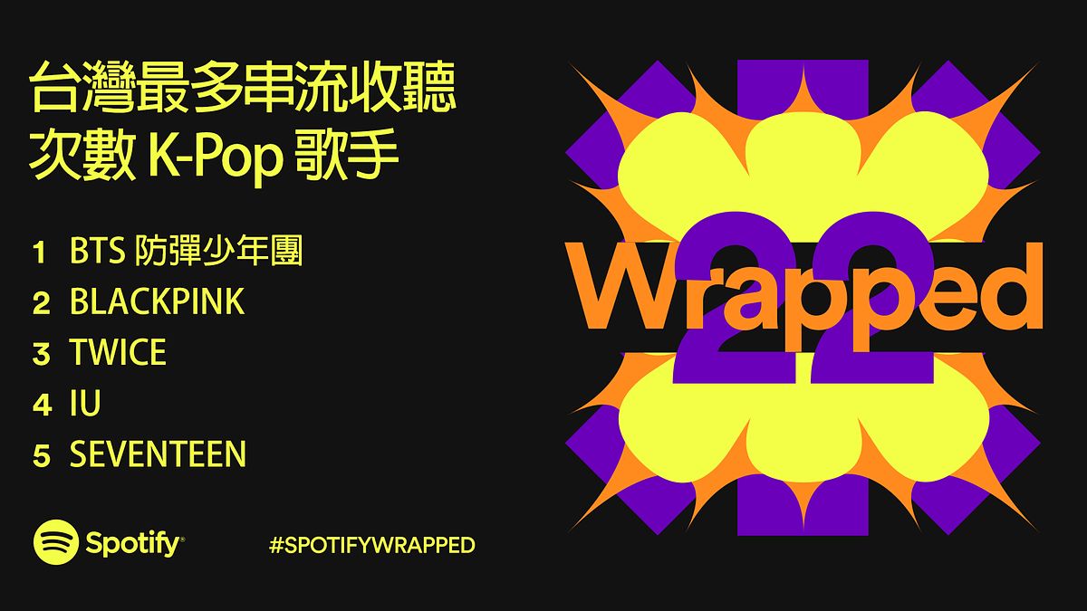 BTS 防彈少年團與 BLACKPINK 持續引領台灣韓流風潮,佔據台灣最多串流收聽次數 K-Pop 歌手前二名。此外出道僅一年的大勢女團 IVE 更獲得台灣最多串流收聽次數 K-Pop 歌曲第一名,〈LOVE DIVE〉成為台灣 K-Pop 聽眾年度最愛歌曲!