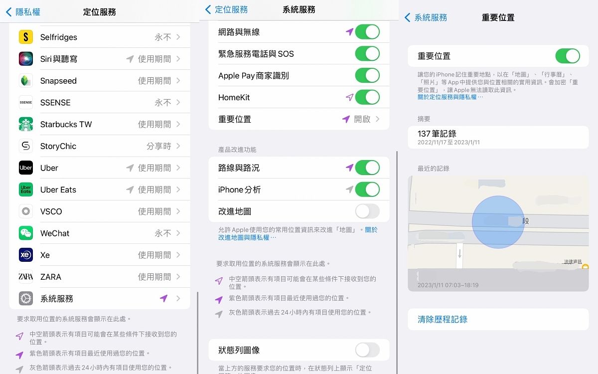 這其實是延續前一個方法的延伸,在iPhone系統中定位服務的地方往下滑,可以看到「系統服務」這個選項,按進去後再下滑會看到「重要位置」,這功能是iPhone會自動記錄你所前往過的地點以及時間,若你不想被iPhone洩漏你的行蹤,那麼建議可以將重要位置關閉喔!