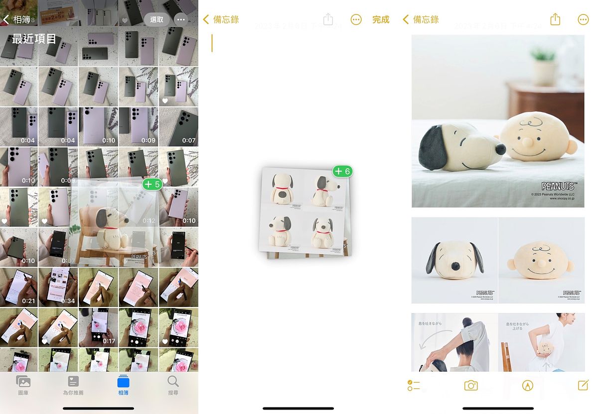 批量選取照片後,持續拖曳到相簿或者備忘錄中,就能儲存或貼上囉!