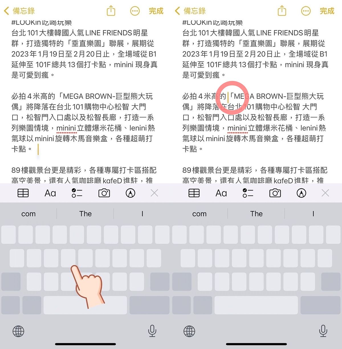 當長按空白鍵之後,鍵盤就會全部反白,只要在上面移動手指就如同變成滑鼠般,能輕鬆將由標移至準確的位置囉!