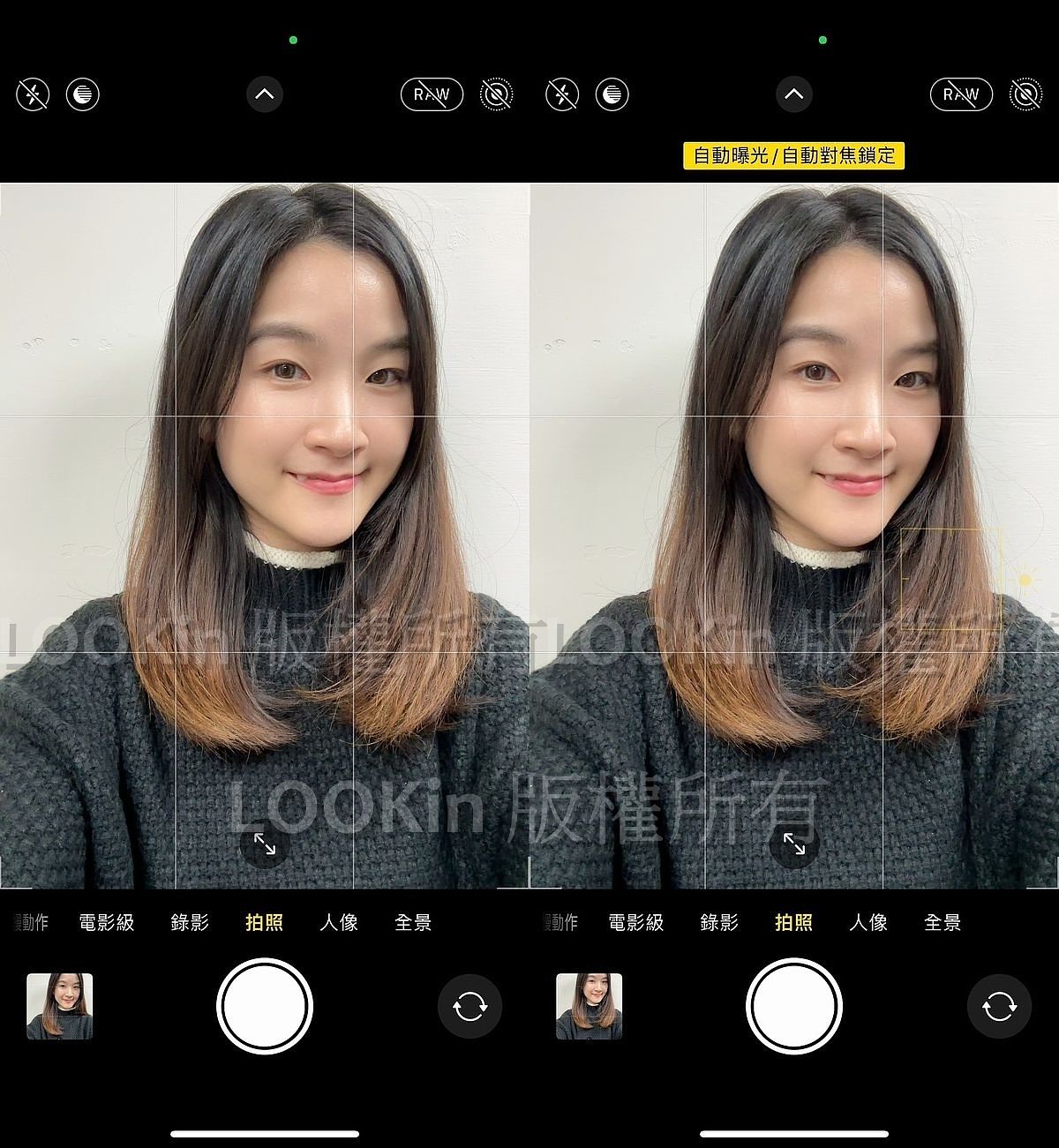 iPhone相機有自動設定對焦和曝光值的功能,拍攝時點擊螢幕上任意位置可以調節亮度,當調到心目中滿意的亮度時,長按螢幕即可打開「自動曝光/自動對焦鎖定」功能,這樣無論在鏡頭中怎麼移動,也不擔心臉暗掉或者曝光過度,若想要解鎖,點一下螢幕即可!