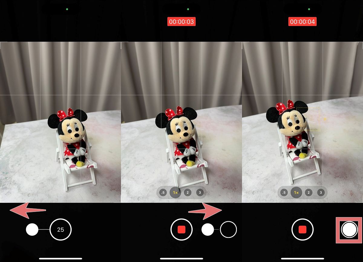 進入拍照模式,長按拍攝鈕向左滑會快速進入連拍模式、向右滑則會快速進入攝影模式,當進入攝影模式, 按下右側的白色圓形拍攝鈕,就能同時在攝影狀態下拍攝當下的照片喔!