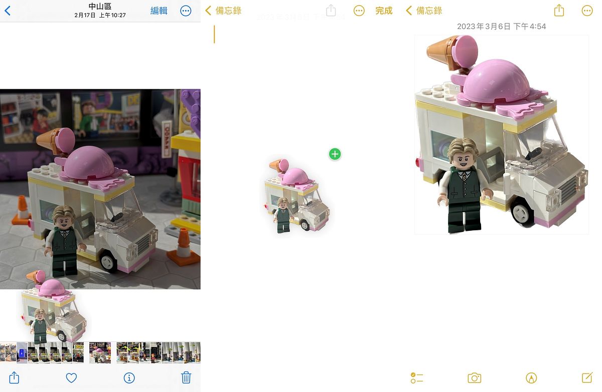 長按照片當中的主題進行提取,並且長按不放,以另外一隻手點開備忘錄APP,打開後放掉長按主題就能貼上,並且儲存唷!