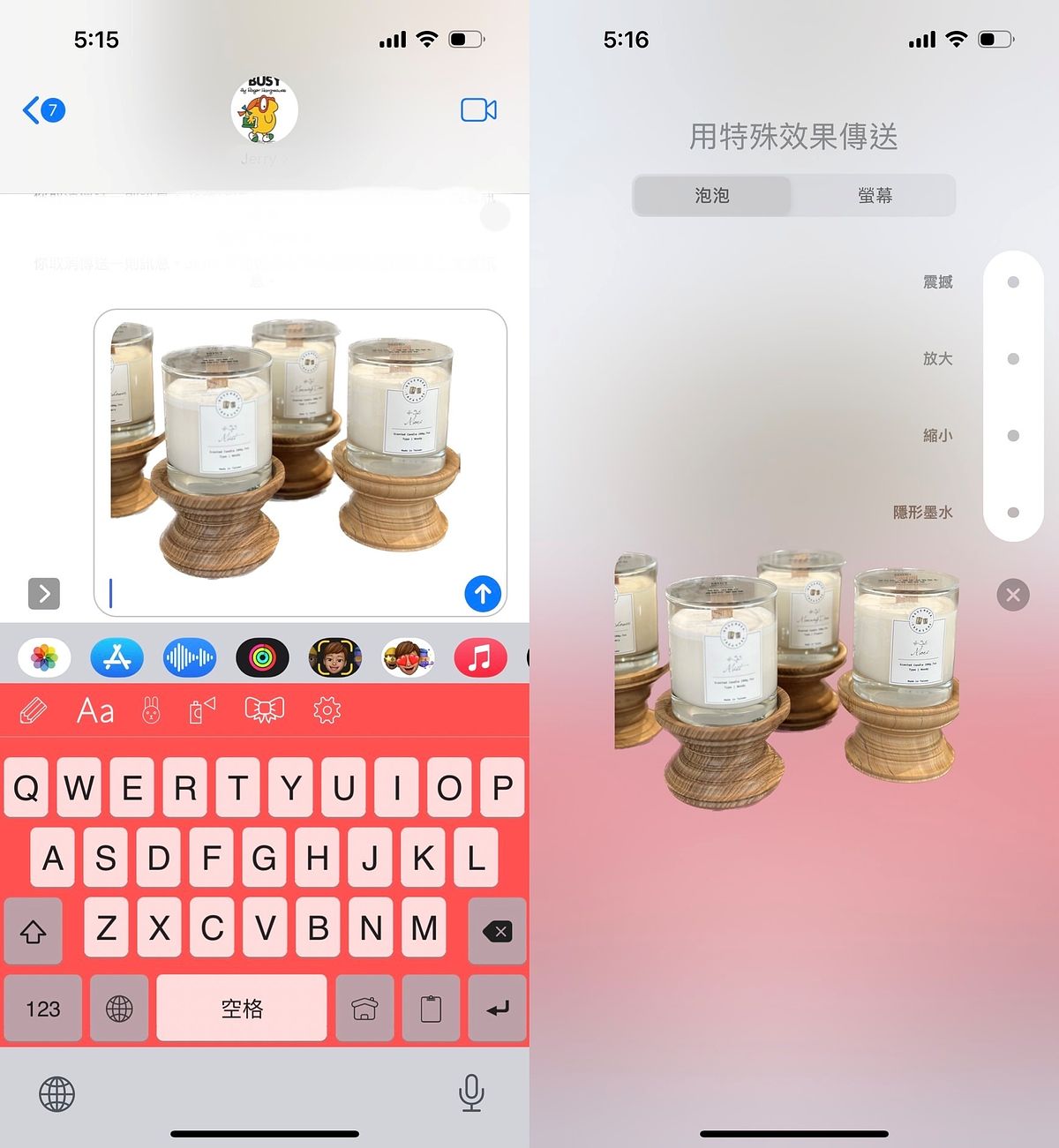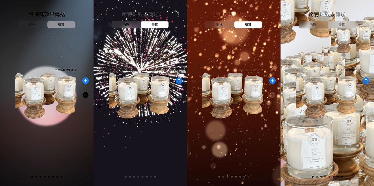 若想將圖片以以特殊效果傳送,只要在傳送前長按話框中右方的藍色箭頭,便能看到「泡泡」以及「螢幕」兩種類型效果可選擇!