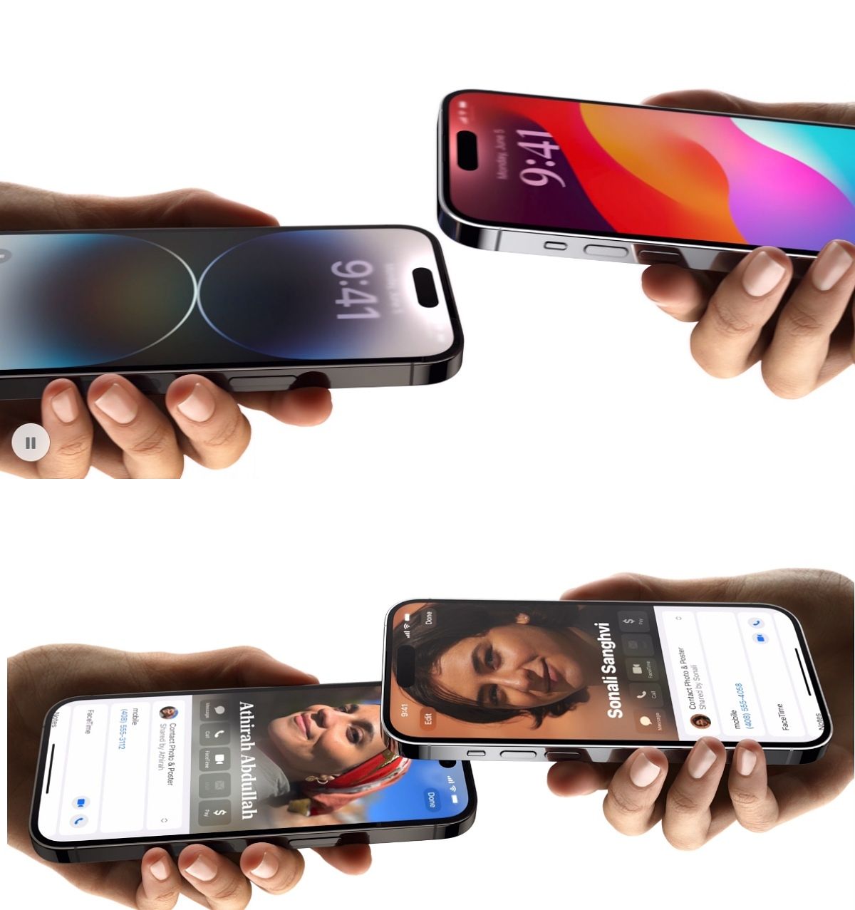 新登場的NameDrop,只要將iPhone彼此靠近,或是iPhone和Apple Watch放在一起,就能輕鬆分享聯絡資訊。同樣的透過這個動作,也可以分享內容或開始「同播共享」,可以在兩台iPhone裝置鄰近的時候一起聽音樂、看電影或玩遊戲。