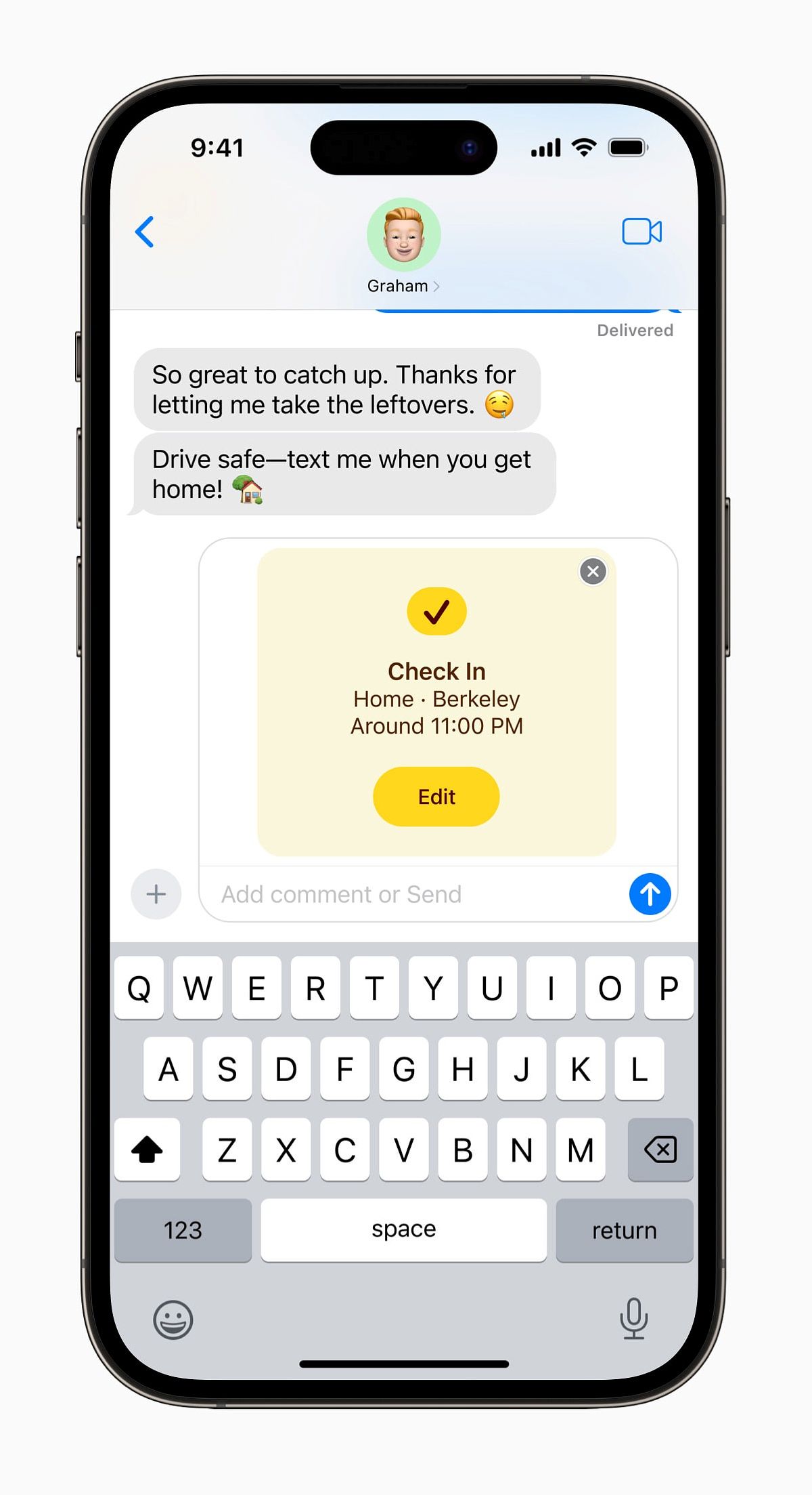 「訊息」新增了「平安通報」功能,當使用者啟動此項功能,多項實用資訊將與選定的聯絡人分享,包括確切位置、電池電量和行動電話服務狀態等,對方會在使用者抵達目的地時自動收到通知,並且所有資訊都是以端對端加密的方式分享。
