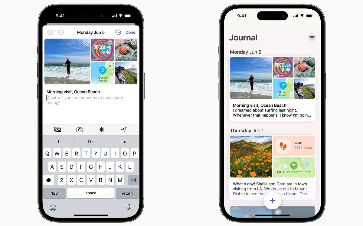 「日誌」app能由系統提供個人化的建議,是從照片、人物、地點、體能訓練等近期動態中,以智慧化的方式精選而得,再也不會因為不知怎麼為日誌開頭,而無法持續寫日誌的習慣,甚至還能設定排程通知。為維持隱私也具備上鎖功能,並使用裝置端處理和端對端加密,確保包括Apple在內都沒有人能取得使用者的日誌內容。
