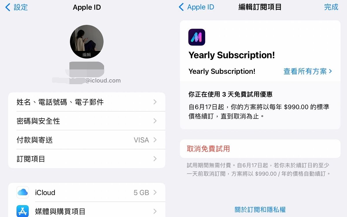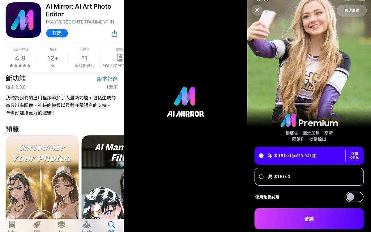 快一起將《ai mirror》APP下載起來!在打開APP後,系統會先要求訂閱付費,此時先將「使用免費試用」開啟,再按下確認以訂閱這款APP,但不用擔心,此時APP會先提供三天的免費試用期,大家可以在這期間近期試玩、使用APP裡的AI照片生成功能,在三天內到手機「系統」→點擊「個人頭像」→「訂閱項目」→「取消訂閱」即不會被扣款囉!