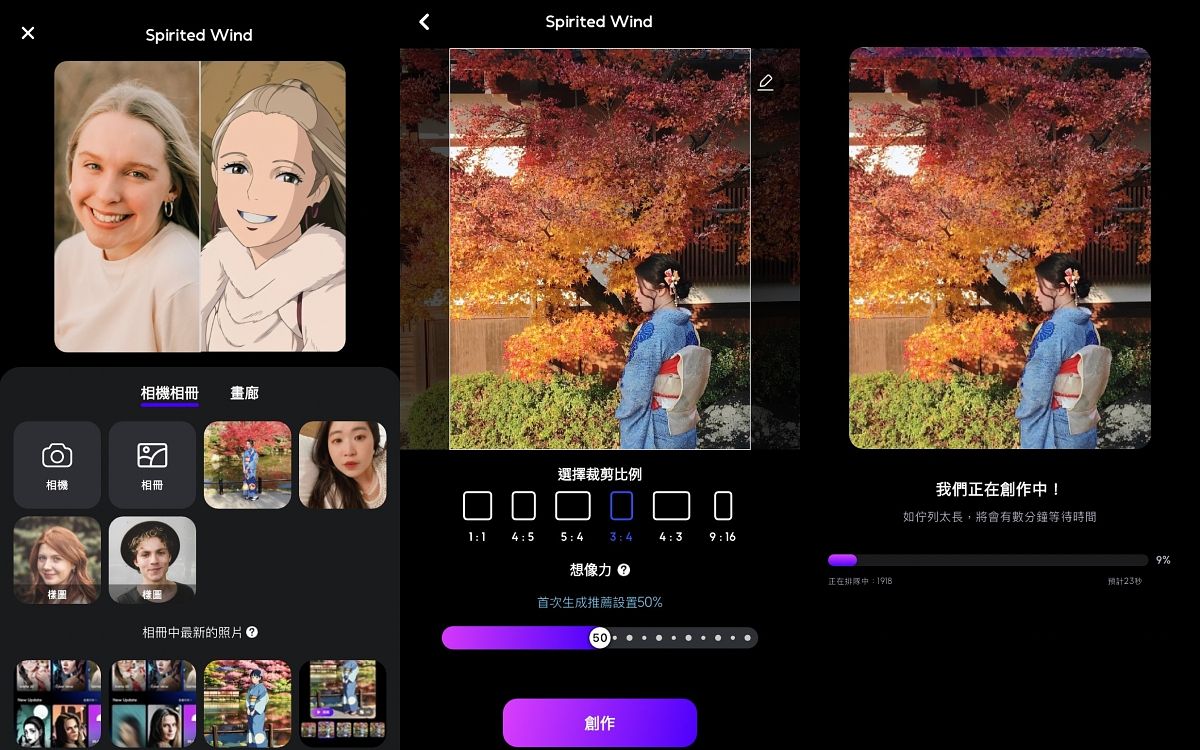 訂閱完成後就可以開始使用APP,頁面主要顯示多個AI照片生成的主題風格類別,這次要介紹的「吉卜力畫風」則屬於「Spirited Wind」,選擇風格類別後可直接拍照或至手機相簿挑選照片,接著能選擇照片尺寸、裁切大小與位置,並可調整想像力%數,設定好後按下最下方的「創作」,APP就會自動開始使用AI功能生成照片囉!