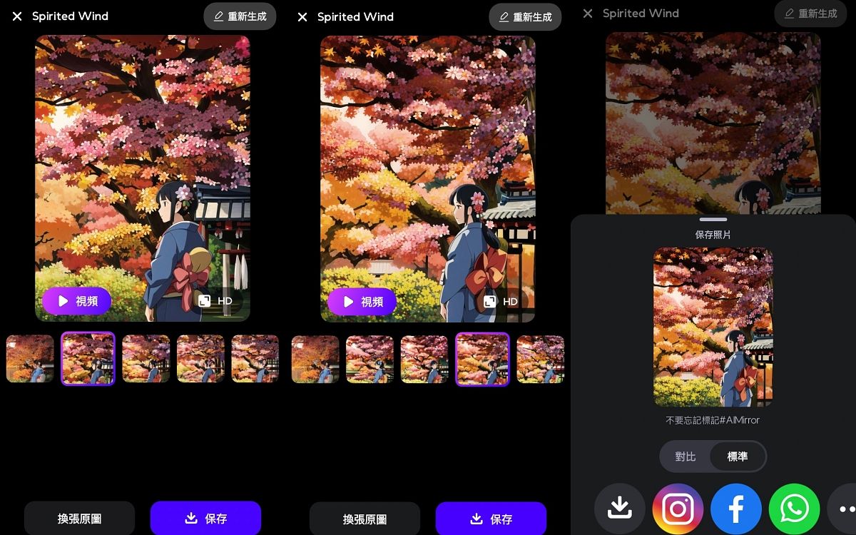 每張照片在《ai mirror》APP中轉換一次都會出現四種不同效果的AI模擬風格照片,在人物、物品及背景上都會有不同的變化,可以隨意挑選下載,若都不滿意也可按又上風「重新生成」,每張生成的AI模擬風格照片都可以預覽、執行HD畫質或視頻影片,選擇好喜歡的照片後按右下方「保存」就能將照片下載至手機相簿,非常直觀性又零難度的操作,重點是每張照片都太好看了!彷彿直接進入吉卜力的動畫世界中,自己化身成為故事主角,張張都是電影海報呢~