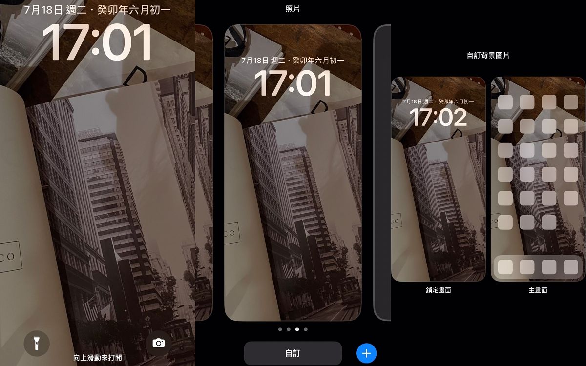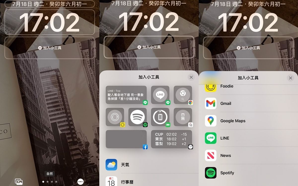 首先在iPhone手機的螢幕鎖定畫面處,臉部辨識解鎖後先不向上滑動打開,先以手指長按螢幕畫面,讓螢幕縮小並點選下方「自訂」並選擇左側「鎖定畫面」後,就能在螢幕時鐘下方「加入小工具」的框框中加入各種需要的快捷工具,點擊「加入小工具」下方會彈跳出各種小工具可以選擇,下滑可看到天氣、行事曆、Spotify、Chrome等各種APP。