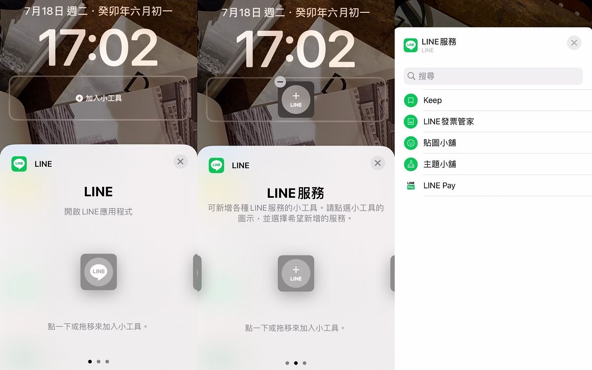 接著在加入小工具APP選擇列表下滑,看到「LINE」後直接點擊,會彈跳出LINE APP的小工具介紹,往左滑選擇第二個「LINE服務」,點一下就能將「+LINE」小工具加到鎖定螢幕的屏幕小工具中,此時再點擊一次上方已增加的小工具「+LINE」方框圖示,就可以選擇不同的LINE服務,這裡選擇「LINE PAY」就能直接設定快捷付款好囉!
