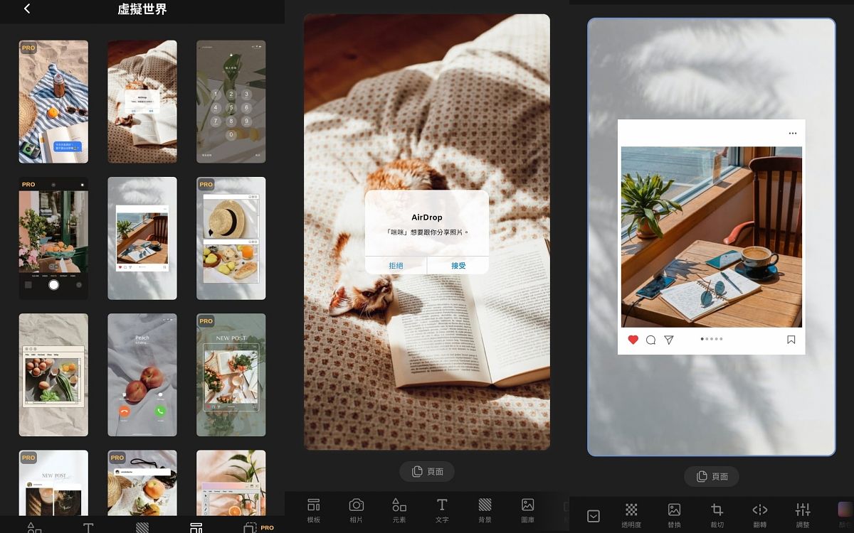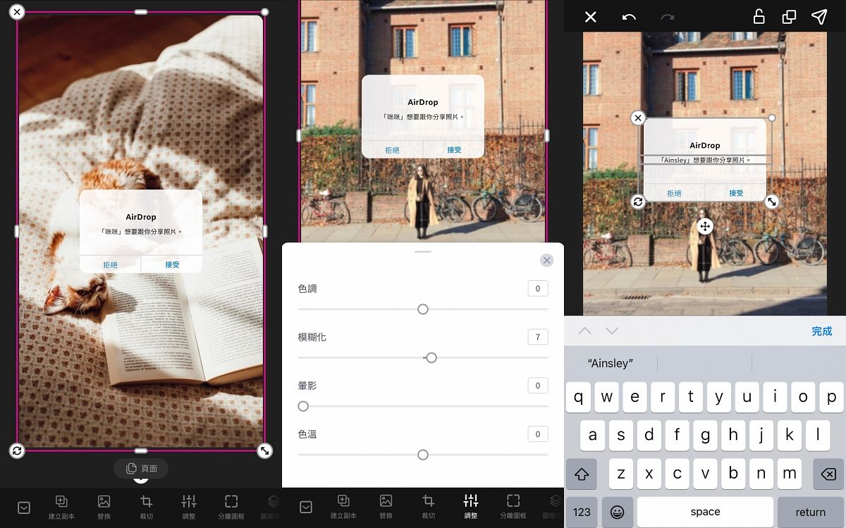接著選擇一個想使用的模版後(這裡示範選擇iPhone手機AirDrop樣式模版),進入編輯畫面可利用下方各功能來編輯目前的模版設計,可更換圖片、裁切、調整圖片亮度對比或模糊度等,模版上的裝飾元素也可任意調整位置、重新編輯文字等,非常方便操作又富有變化性,就算APP苦手也能輕鬆駕馭!