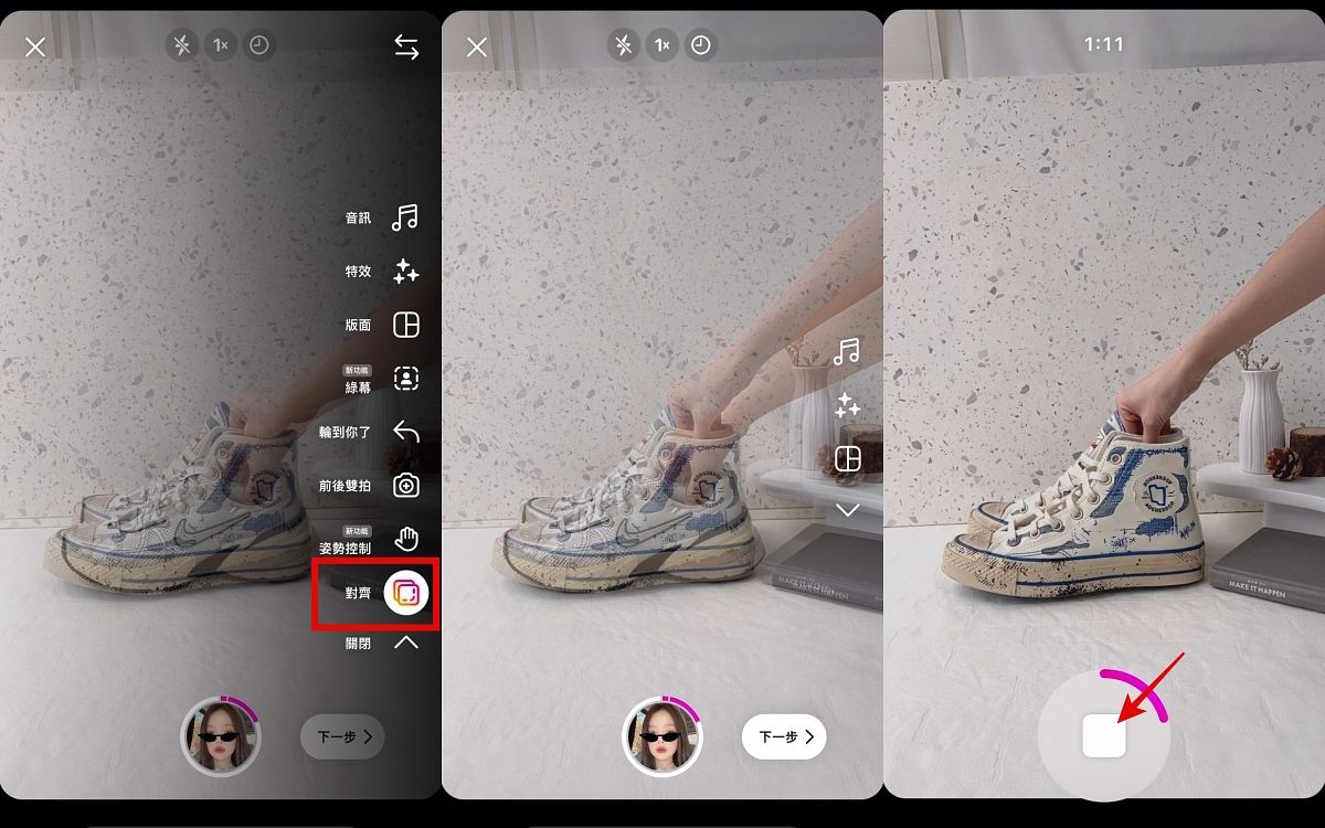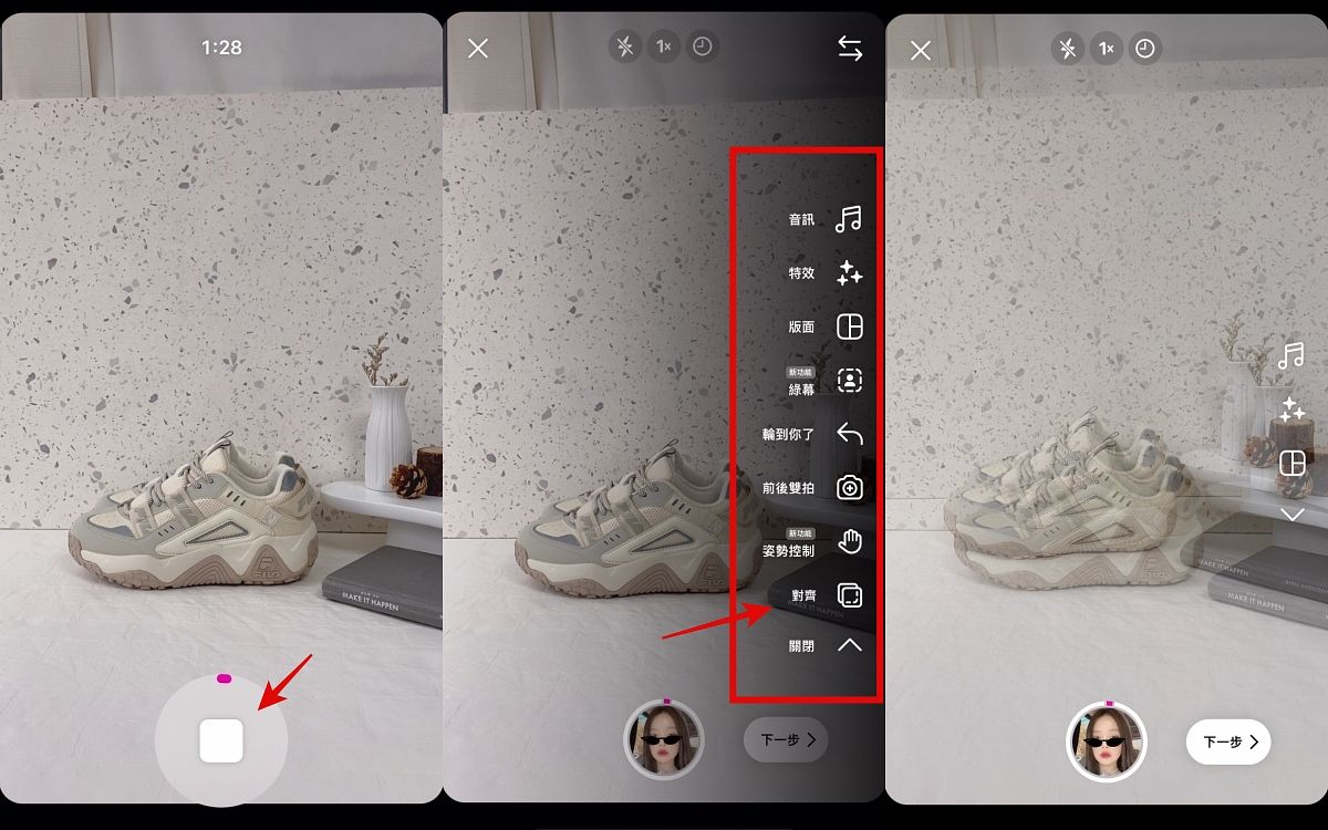 首先開啟IG限動選擇「連續短片」拍攝功能,先抓好想要的畫面之後,錄第一段畫面,之後功能列表會出現一個「對齊」功能按下,就會出現前一個錄製畫面的淡化影像,方便我們直接對齊拍攝主角,無論是人事物品、背景都可以很輕鬆的對正位置。