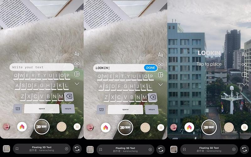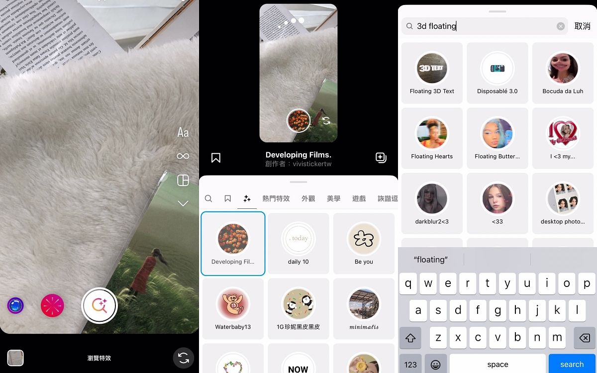 首先開啟IG限時動態拍攝功能畫面,最下方選擇濾鏡處由右往左滑到底,按下「瀏覽特效」後選擇最右邊的「放大鏡」圖示的搜尋功能,在search bar處輸入「Floating 3D Text」關鍵字,就能找到現在最夯的3D漂浮英文字體濾鏡,點擊一下就可以直接使用拍攝囉!