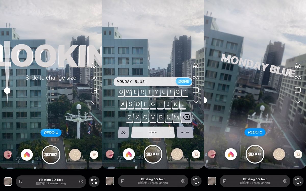 而漂浮3D英文字的大小也能透過側邊拉桿來調整大小尺寸,甚至也可以按下方藍色「REDO」重新輸入文字內容,漂浮的英文字會隨著畫面轉移或移動而有所改變,特別適合使用在限動錄影上,整個3D漂浮的特效會更加明顯,快一起來玩玩看!