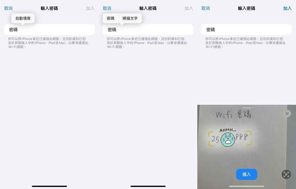 每到了一個餐廳、咖啡廳,總不免要問現場公用WiFi密碼的人,這招請一定要學起來!再也無須反覆覆誦一長串店家設定的神秘密碼,也不用來回對照確認有沒有打錯!同樣利用「自動填寫」→「掃描文字」功能,將鏡頭對向店家寫在menu或者牆上的WiFi 密碼,立刻暢網無阻 (編輯實測,就算是手寫也能智慧讀取免擔心) !