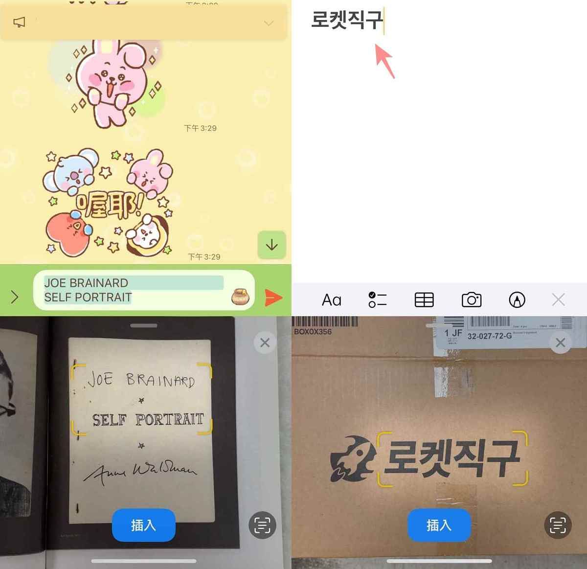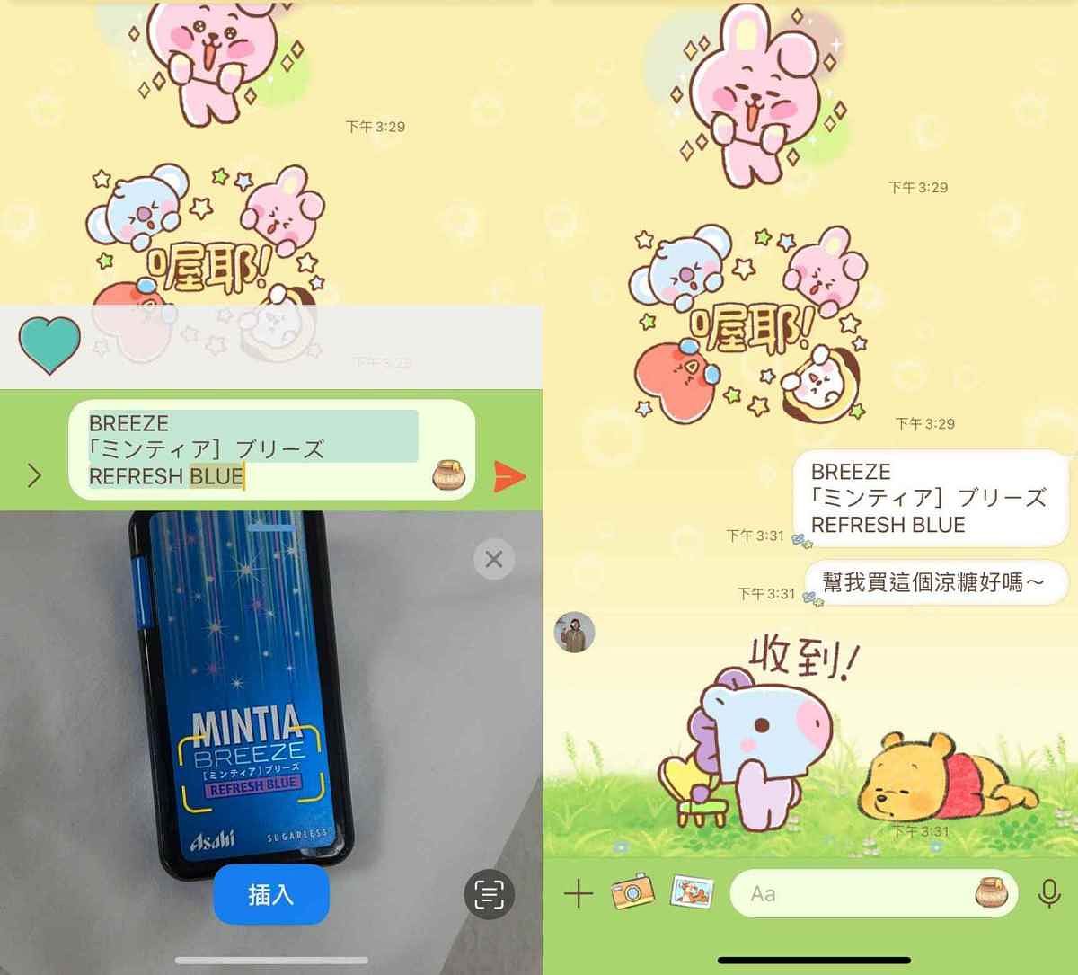 當點選「掃描文字」之後,原本的鍵盤會變成拍照模式,這時只要準備好想要請朋友代買的商品,將鏡頭對準商品的名稱,讓鏡頭對焦在文字上,商品上的文字就會精準地出現在對話框中,直接原封不動傳給朋友就可以囉!
