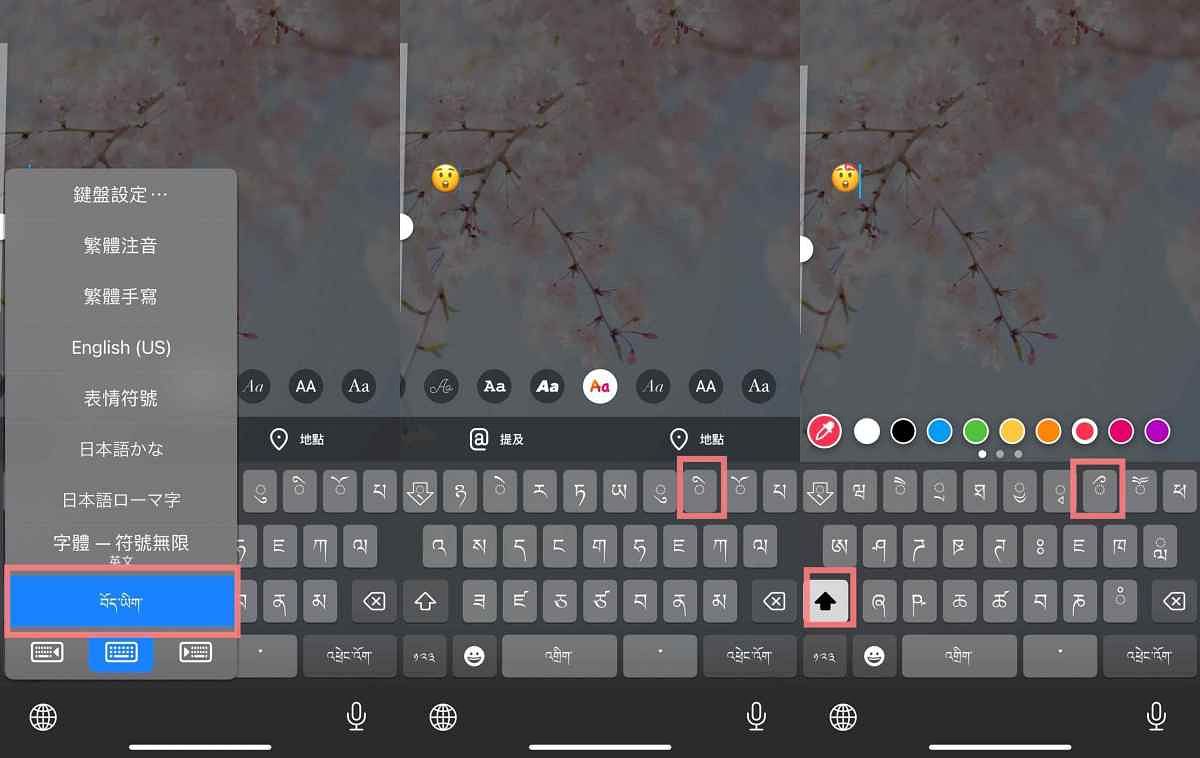 先按鍵盤上的地球符號,將輸入法轉換為藏語輸入後,點選第一排右邊第三個文字,接著按轉換大小寫的「↑」,再按一次右邊第三個文字,接著神奇的事情就發生了!