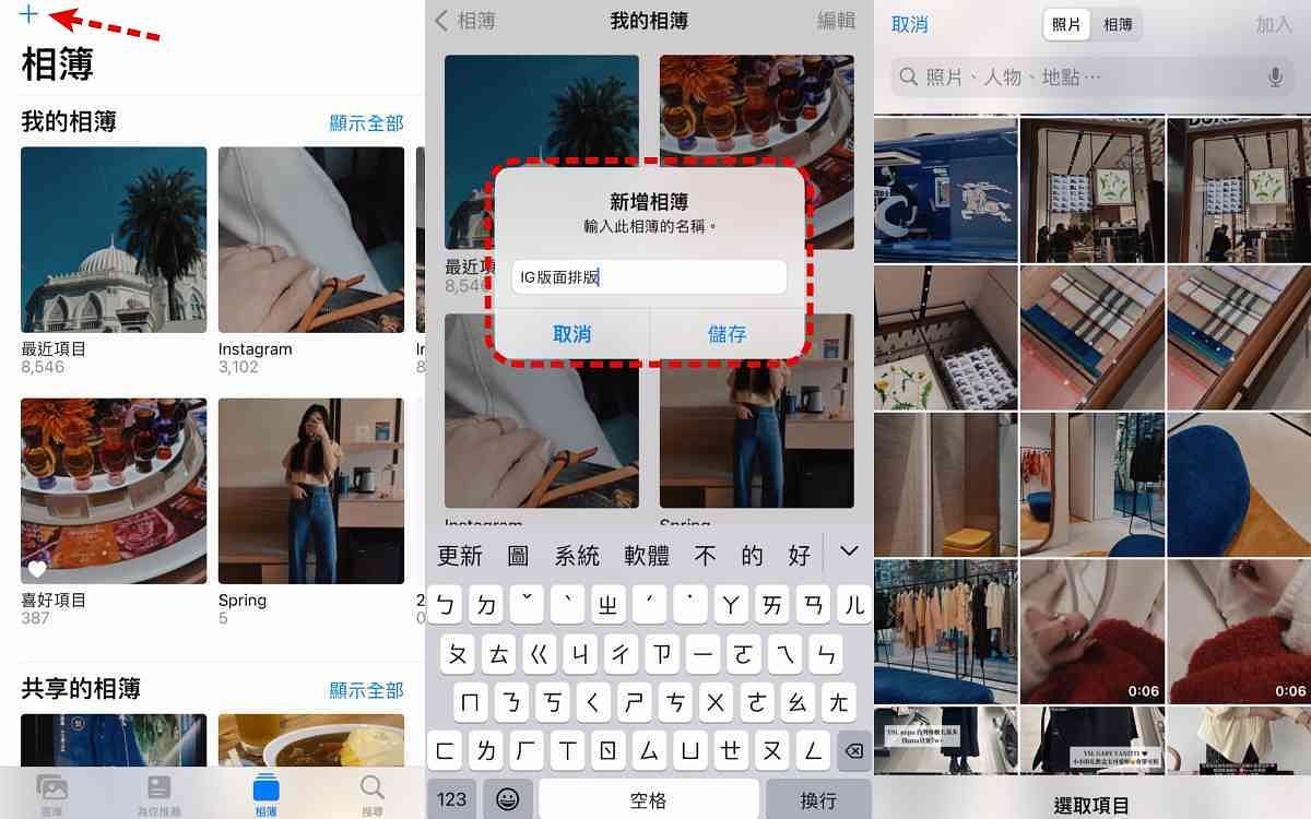 首先打開iPhone「相簿」→ 按左上角「+」建立新相簿,並同時命名後按「儲存」,就會進入新相簿中 → 此時在新相簿裡自由「點選添加」欲排版的照片即可,完成後此新相簿就可直接用來作為IG版面排版的預覽囉!