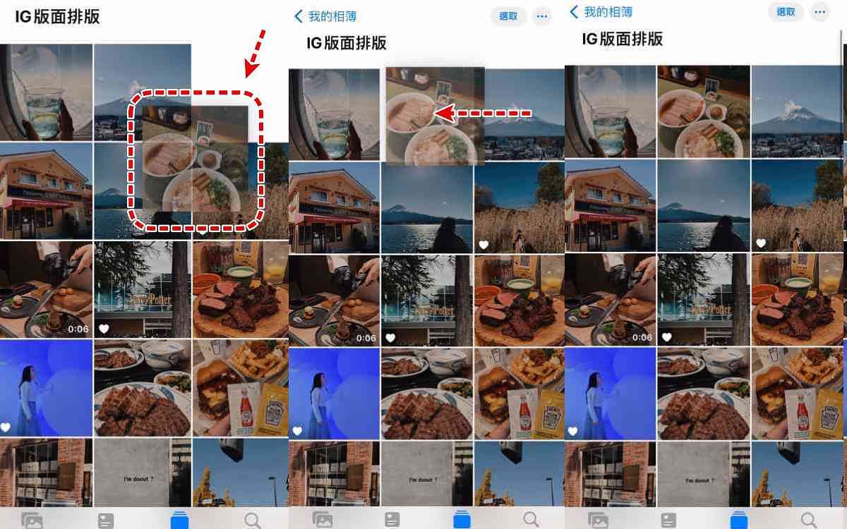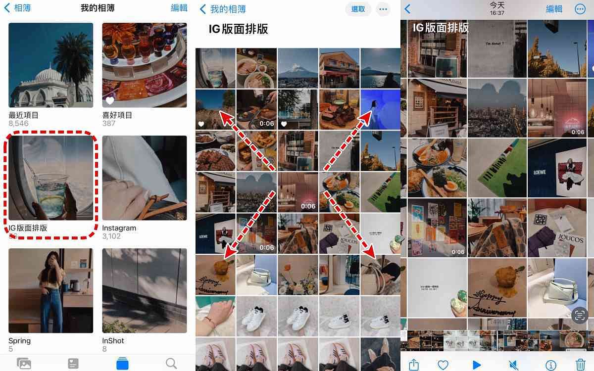 進入剛剛創建的新相簿後,可以看到所有點選的照片都在裡面,此時若版面顯示並非為三格一行的話,只要用兩根手指頭在螢幕上從中心滑動放大手勢,就能調整成三格照片一行,即和IG頁面的排版形式相同了。