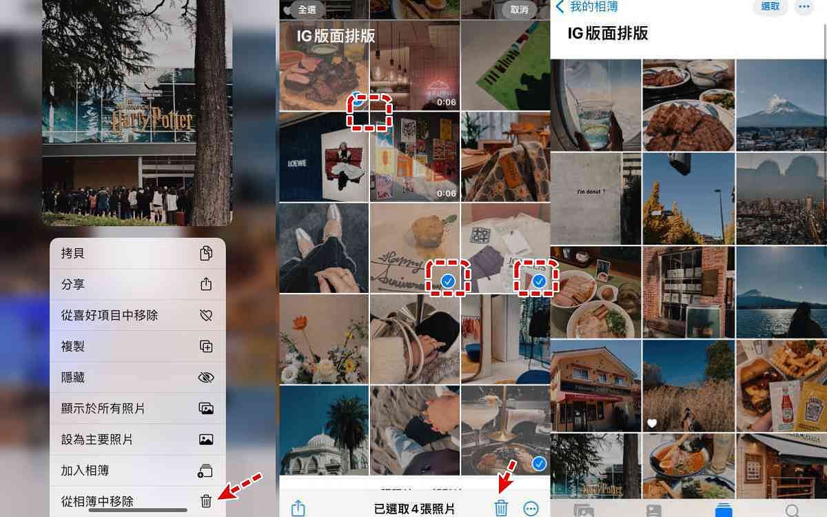 也可以將剛剛選擇的照片從此相簿中移除,只需要「長按」該張照片就會跳出功能選單,選擇「從相簿中移除」就代表只是從此相簿中移除而非整張照片從手機相簿刪除,也可以透過「選取」一次選擇多張照片一起用垃圾桶移除,是不是超級方便又實用!不用再額外下載APP來操作,直接iPhone相簿玩起來,IG版面設計輕鬆搞定!