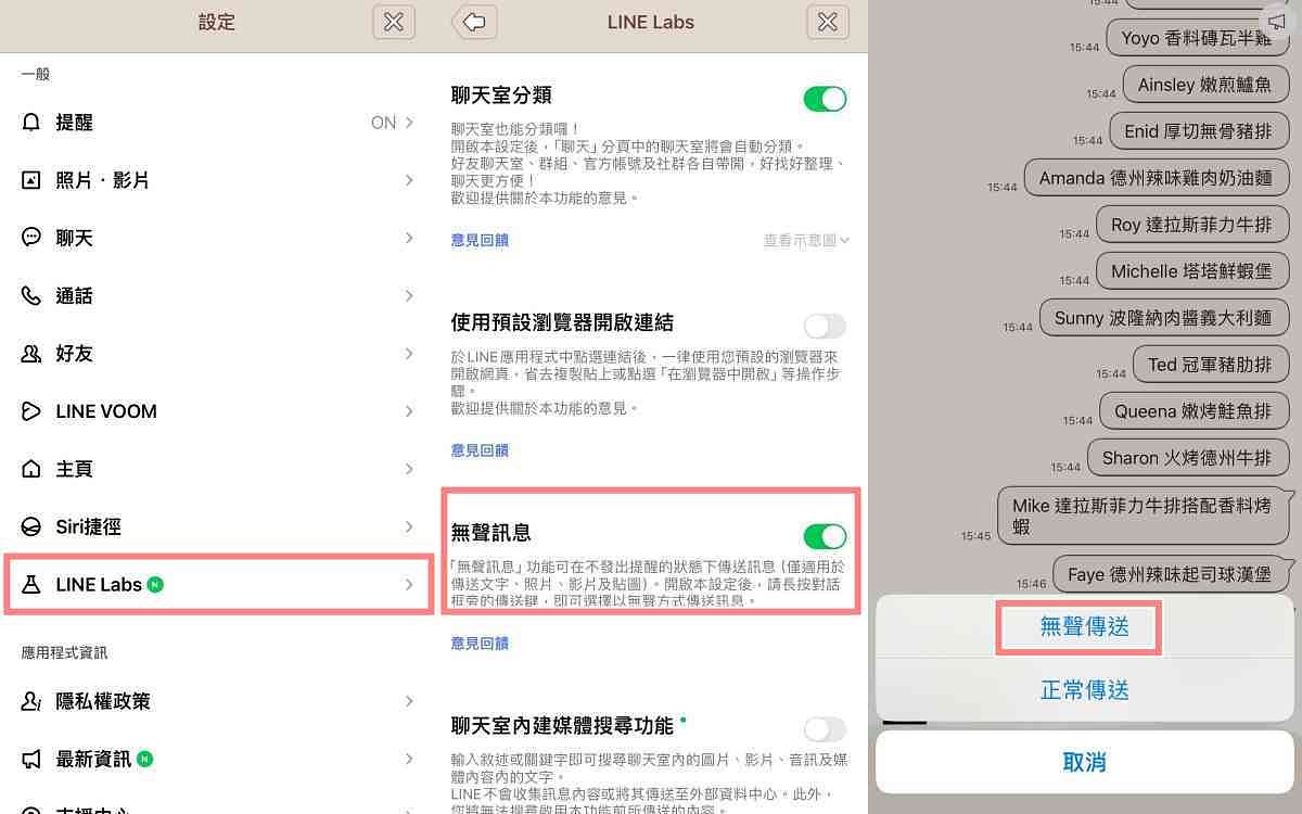 有時候話想到不趕快說就會忘記…就經常在深夜或一些特別的時間想要傳訊息給朋友,但又怕打擾到對方,這時就能傳「無聲訊息」囉!不只能讓對方順利即時收到訊息,又不會冒出聲音提醒打擾,很適合小健忘的人使用呢!