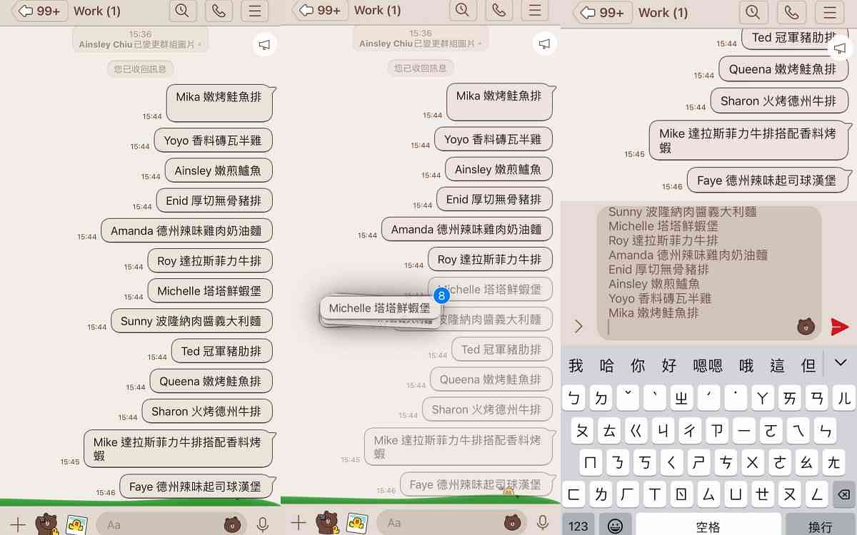 尤其是在群組裡特別好用,如果想一次複製大家你一言我一語的訊息內容,只需要先按住一則訊息往旁邊拖移、手指不要放開,接著用另一隻手手指去點按其他想複製的訊息,就能一則則往第一則訊息收集,當都選擇完畢後移動打字處就能完美地一次複製所有不同訊息的內容了!遭方便好用~