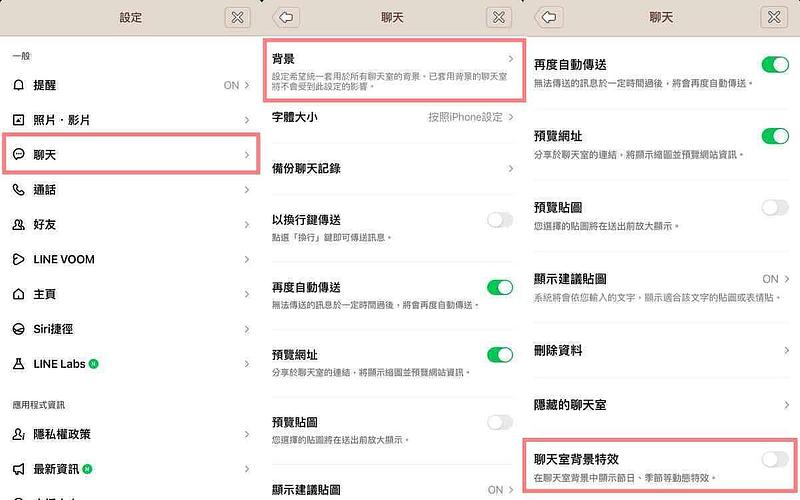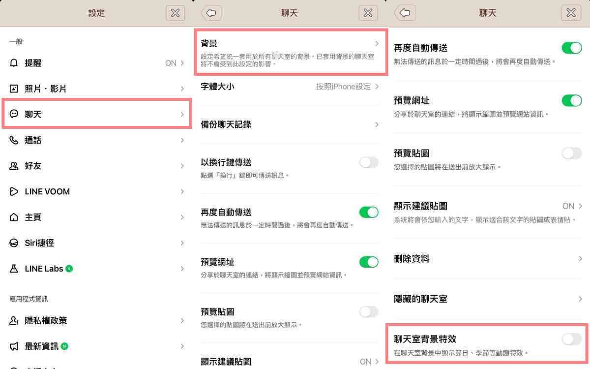在各種特殊節日期間,LINE聊天室都會推出指定訊息內容的背景特效,雖然很應景有趣又可愛,但有時不免不合時宜或造成一些困擾,若想暫時關閉聊天室背景特效能至LINE設定中去關閉或重新開啟聊天室背景特效喔!