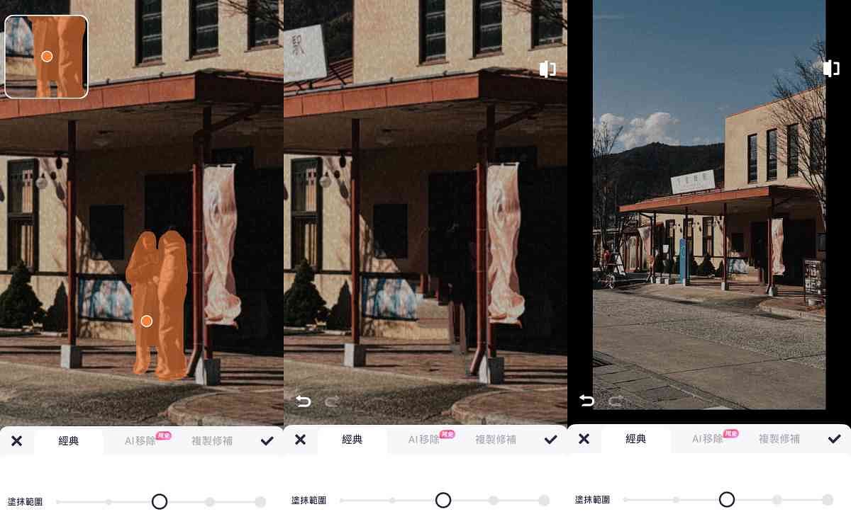 Snapseed也是許多人喜愛的修圖APP之一,對於照片的後製有許多較專業、細節的調控功能,操作的介面及方法也都非常直觀且簡單清楚,匯入照片後點選下方「工具」並選擇「修復」,就可以直接在想要移除的人及物上塗刷,接著APP就會自動幫你把路人雜物等都移除掉囉!小技巧教大家:若覺得不自然可以塗抹兩三次喔~