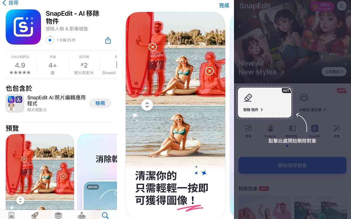 大家最熟悉的「美圖秀秀」絕對是一款女生們手機裡人人必備的基本盤修圖APP!無論是想修臉、修身材都能輕鬆達成美照,甚至連移除掉背景路人、雜物都OK簡單,從「圖片美化」進入匯入照片後,在下方工具列選擇「刪除筆」,就能用筆刷塗刷的方式將要移除的部分塗起來,APP就會自動將他們消除囉!另外也可以用複製修補的方式,任大家選擇使用超貼心!